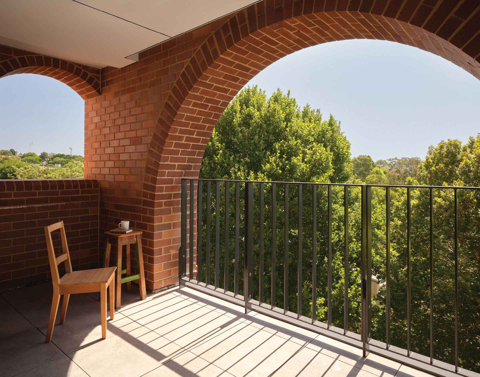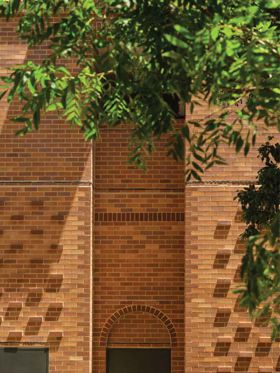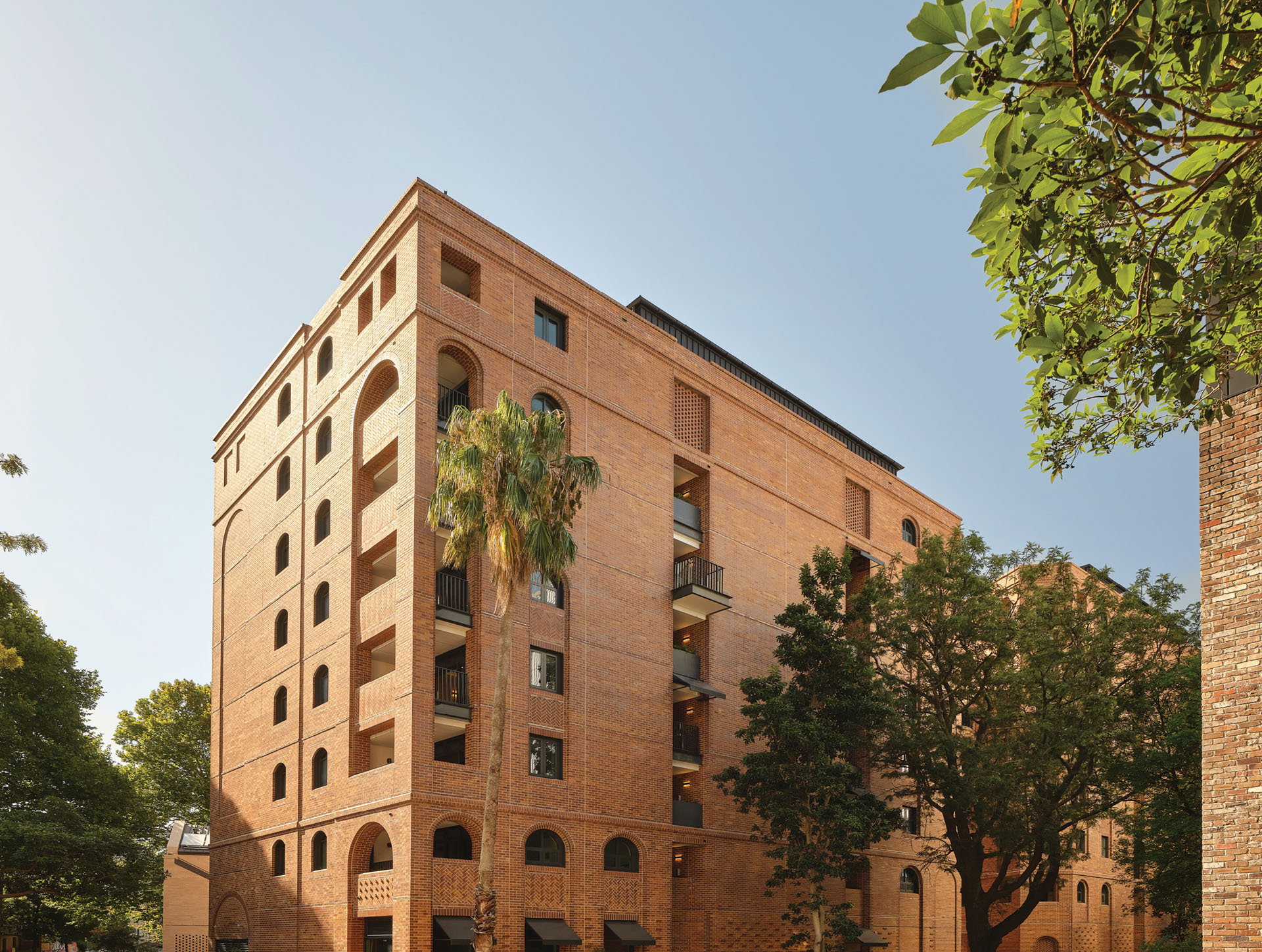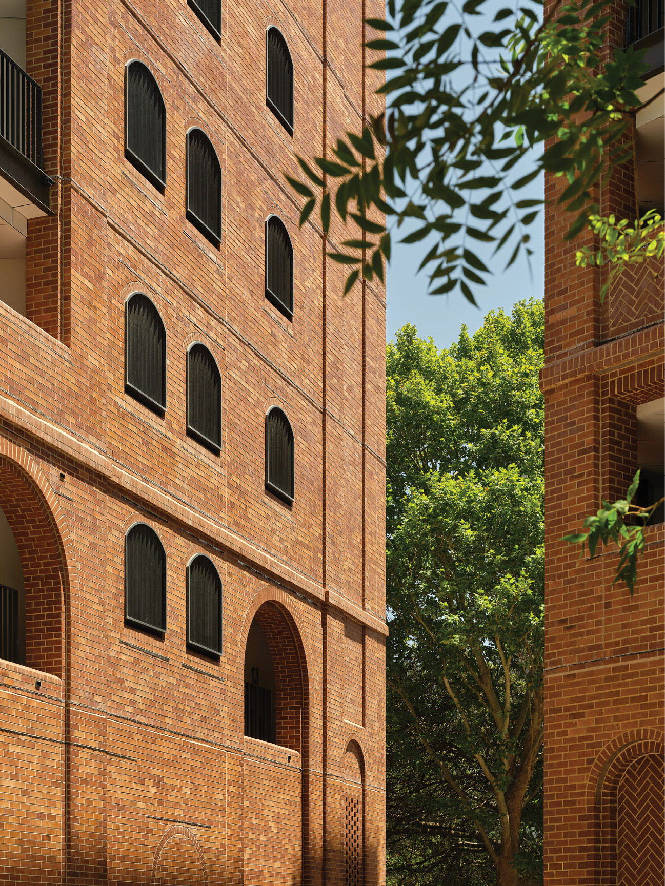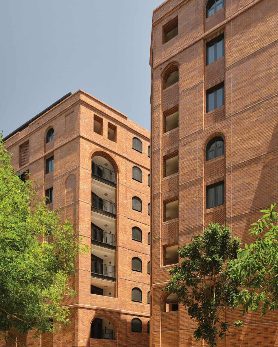 The brickwork showcases traditional detailing and contemporary modulation. Masonry and metalwork create a dynamic composition of arched openings and recesses, providing privacy to balconies and daylight to lift lobbies.