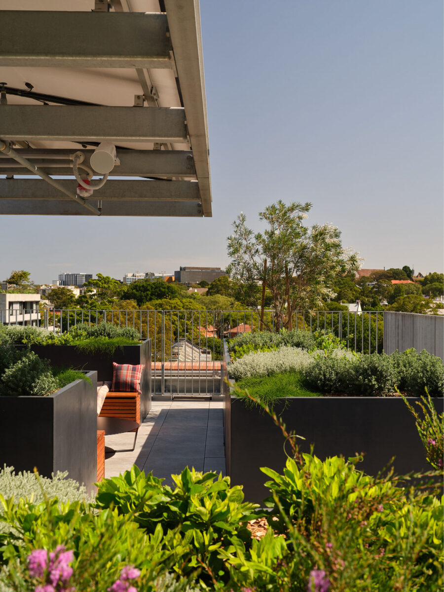 Communal roof gardens on each building provide secure and safe outdoor spaces, and the site planning delivers 15% deep soil area, more than double the ADG requirement. Existing palms were moved and reinstated into courtyard landscape.